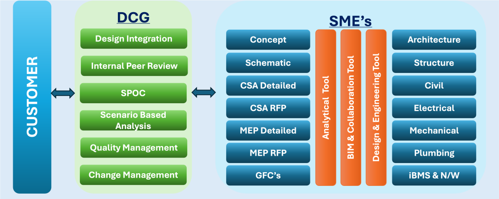 The Customer communicates needs to the DCG (Design Coordination Group), which manages design integration, internal reviews, acts as a single point of contact (SPOC), conducts scenario analysis, ensures quality, and handles change requests.